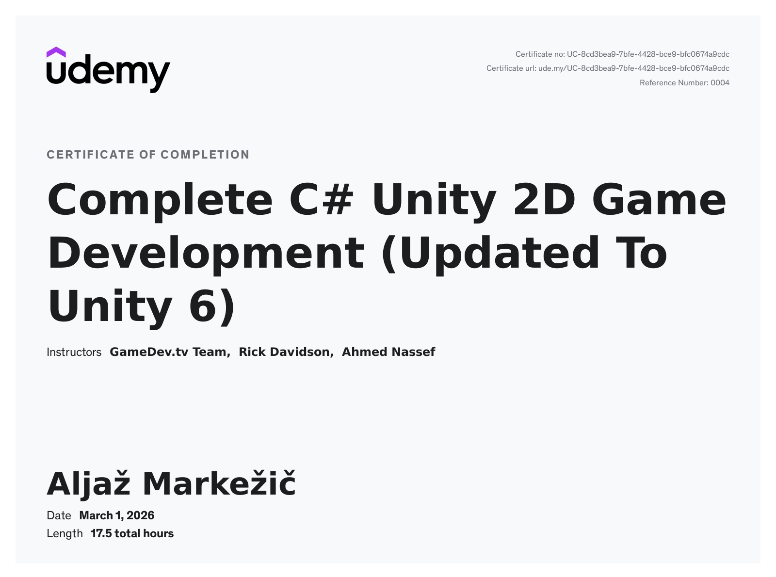 Comprehensive Unity course where I built 4 games, covering core Unity concepts, C# scripting, physics, animation, and game design patterns.